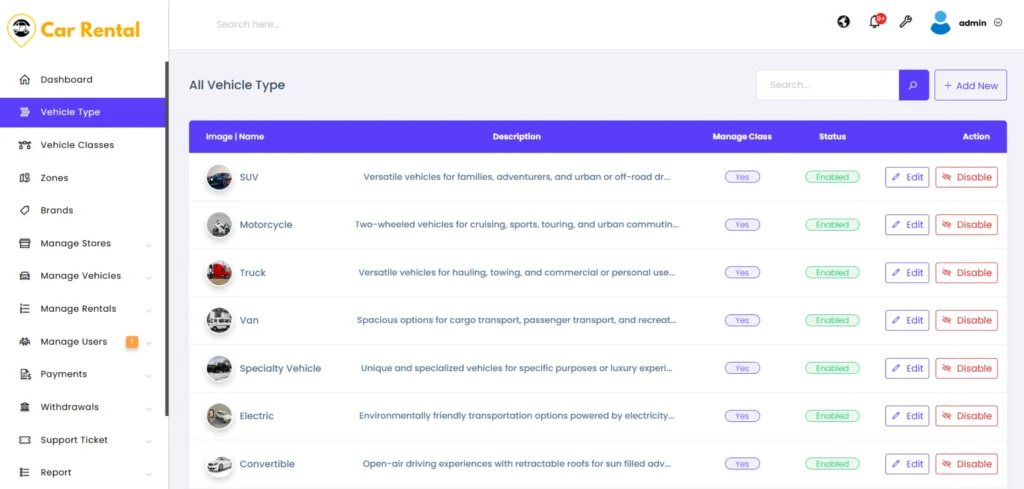 At any time, admins can edit vehicle type details or change their status. Disabling a vehicle type temporarily removes it from listings without deleting data. This flexibility helps platform owners maintain control, ensure accurate listings, and support smooth onboarding for vehicle owners.