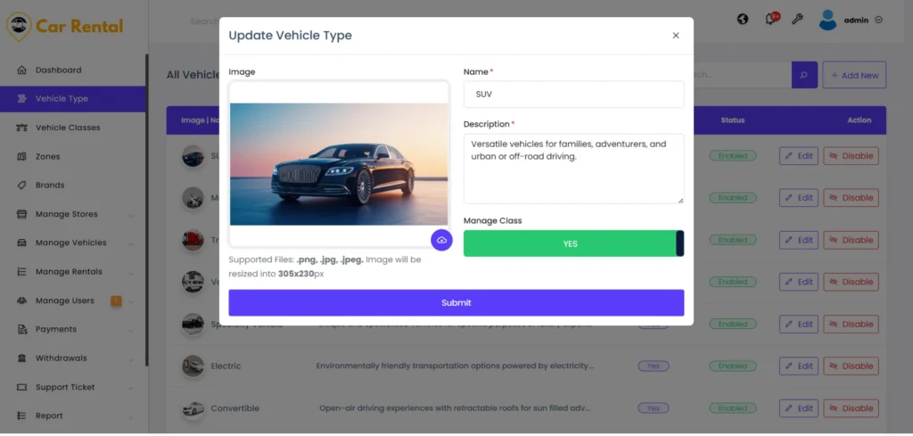 The Manage Class option allows you to add multiple classes, such as SUV or Sedan, under this vehicle type. After filling in the details, submit the form to activate the new vehicle type.