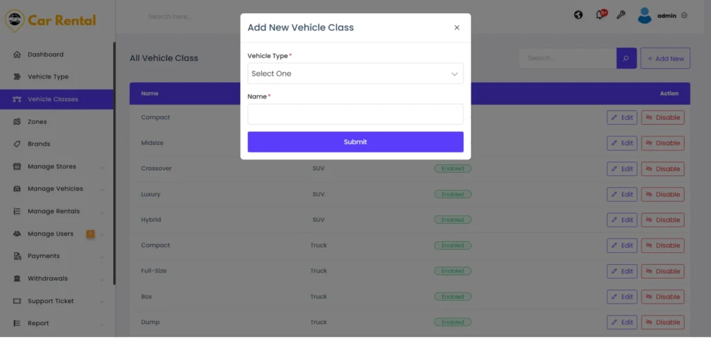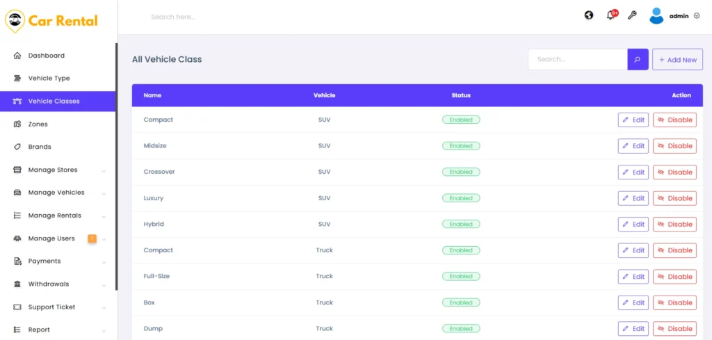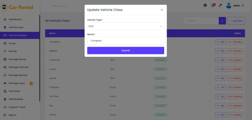 Admins can edit class names or change their status at any time. Disabling a vehicle class temporarily hides it from new listings without removing existing data. This allows platform owners to adapt categories based on market demand and keep the marketplace well-organized.