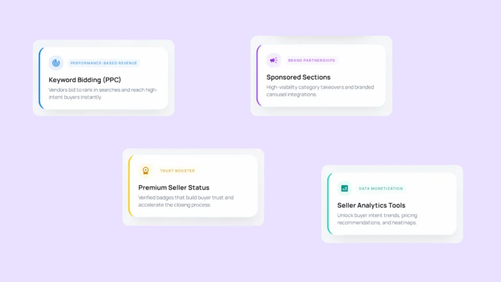 Diversification is the best defense against competition. Beyond the basics, consider Pay-Per-Click (PPC) Advertising, where vendors bid on keywords to appear in specific searches. You can also sell Premium Seller Badges to build trust; a “Verified” status is a powerful incentive for sellers looking to close deals faster.