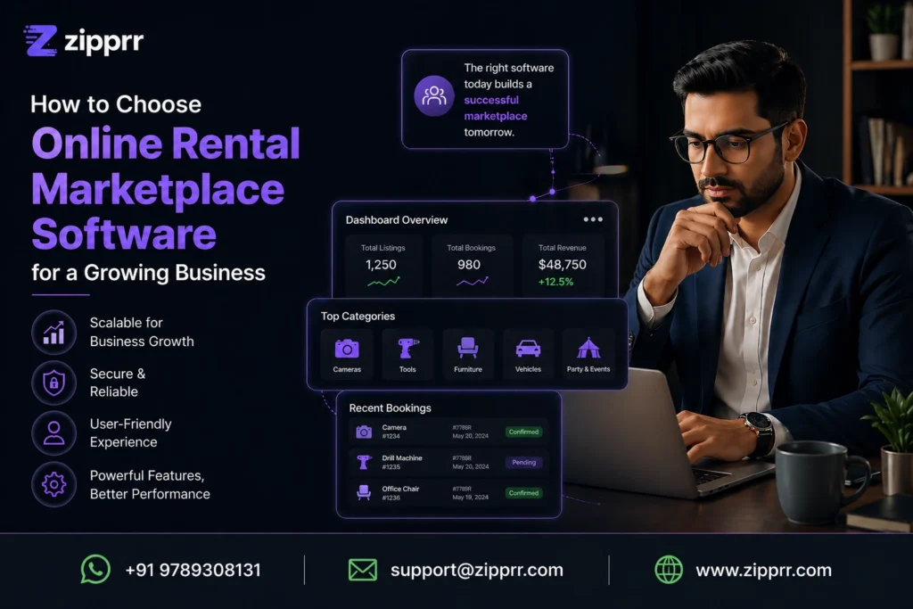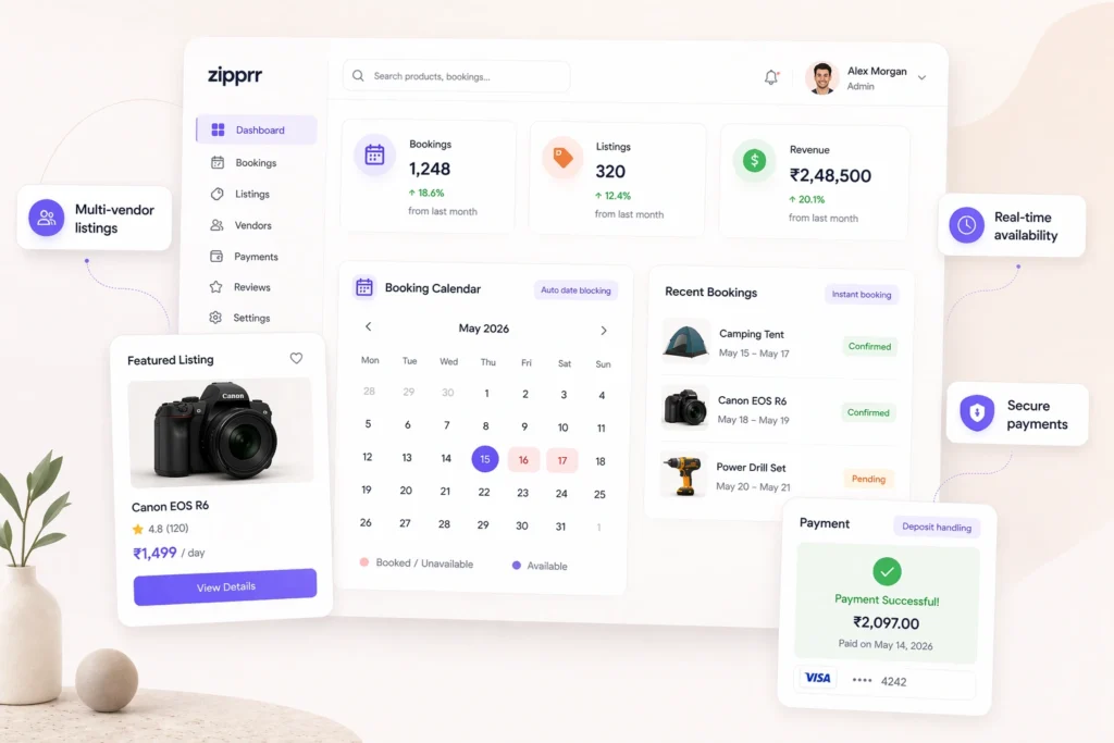 For a growing rental business, choose a platform with multi-vendor support, a booking calendar, a payment gateway, dashboards, refund management, delivery options, and commission tracking. Zipprr provides online rental marketplace software with essential marketplace features at an affordable price, helping startups and entrepreneurs launch a scalable rental platform with confidence.