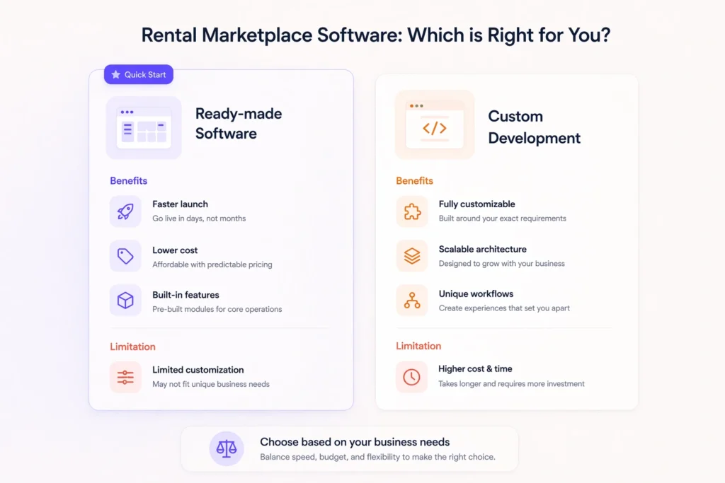 | SaaS rental marketplace platform | Small teams that want hosted software | Easy setup, maintenance handled, subscription pricing | Limited ownership and customization |