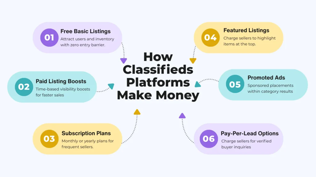 Most successful classifieds platforms adopt a freemium model. Free listings attract inventory and users, while premium options generate revenue.