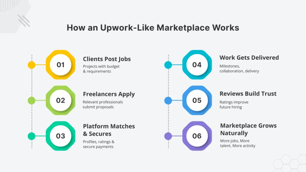 An Upwork-style marketplace is a two-sided platform connecting freelancers who sell skills with clients who need work done. The platform itself doesn’t create value directly; it facilitates transactions, enforces rules, and builds trust so both sides can transact confidently.