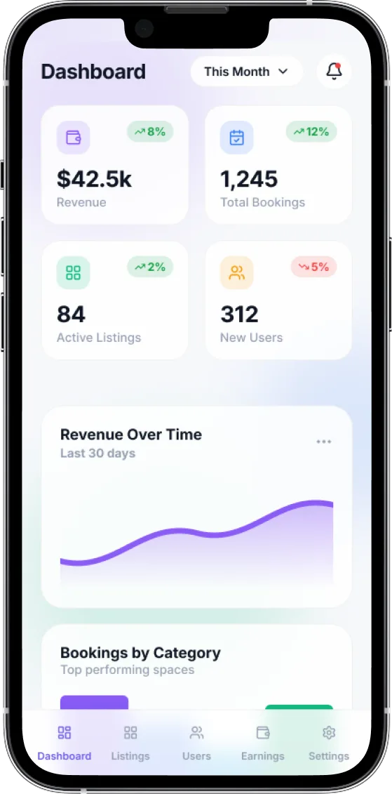 - Centralized Dashboard : Access a real-time overview of platform performance, including total revenue, active users, and booking trends.