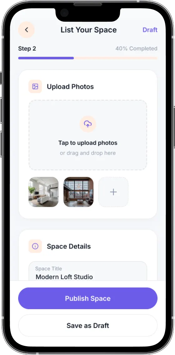 - Effortless Space Listings : Easily list your space with step-by-step guidance, including adding high-quality images and descriptions.